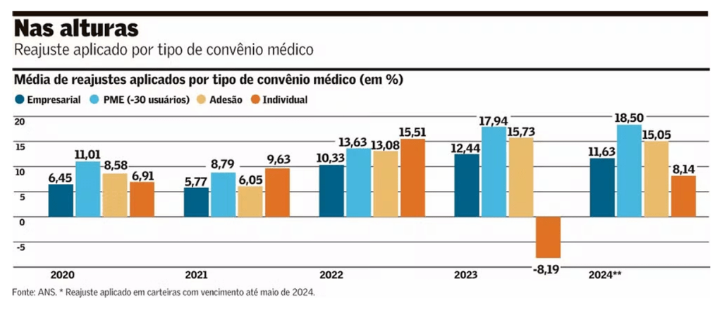 Os planos voltados para pequenas e médias empresas (PME), que somam 8,7 milhões de clientes, também apresentaram uma diminuição nos reajustes. Nos contratos vigentes de maio de 2024 a abril de 2025, a redução no aumento foi em torno de três pontos percentuais, com algumas operadoras implementando cortes de cinco a oito pontos percentuais.